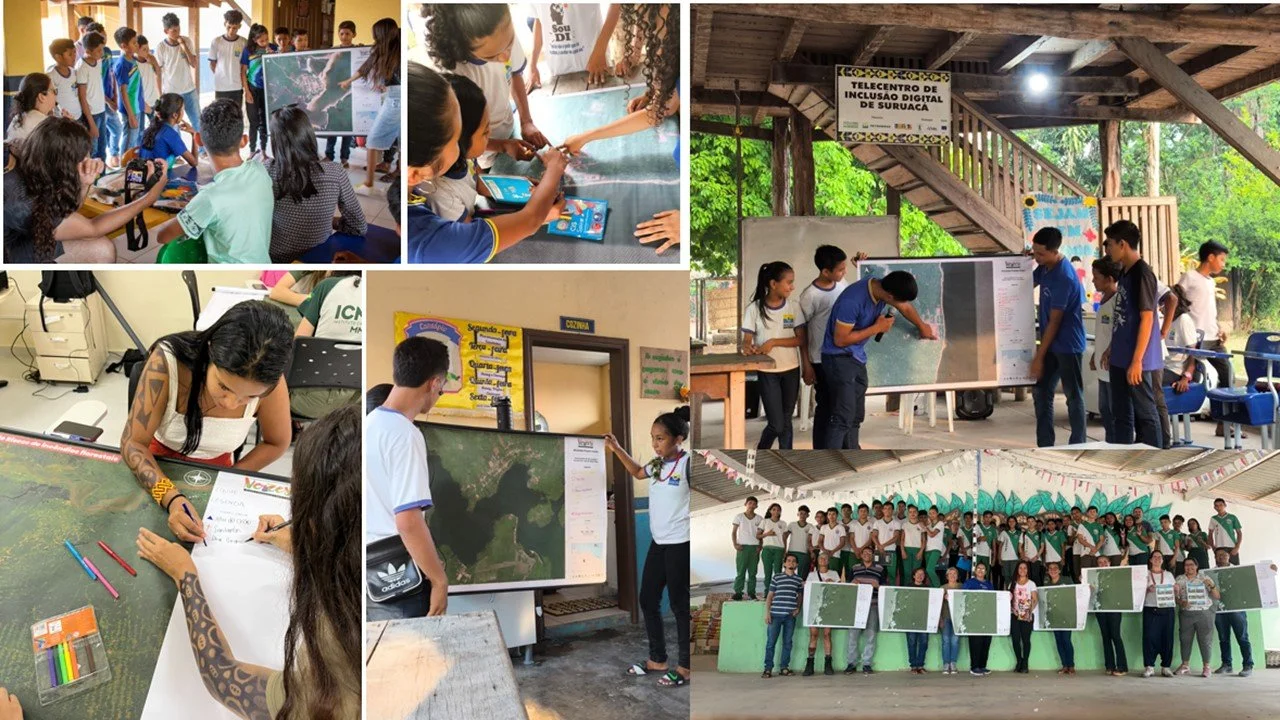 En las escuelas de la Flona Tapajós y Resex Tapajós-Arapiuns, capacitamos a docentes y estudiantes en la elaboración de mapas sociales basados en imágenes de alta resolución de satélites, partiendo de los conceptos básicos de cartografía, como escala, leyenda y orientación. Posteriormente se localizaron puntos de referencia y se realizaron reflexiones sobre el territorio en el que viven y cómo se interrelacionan, y también sobre el papel del bosque y de los ríos en sus vidas. La construcción colectiva permitió la integración de conocimientos entre diferentes generaciones y perspectivas, y fomentó discusiones sobre cómo las sequías y crecidas extremas de los ríos, el humo de los incendios y otros problemas socioambientales los afectan y dónde se producen estos eventos en el territorio o más allá de él. Con base en los puntos abordados, desarrollaron ideas sobre posibles estrategias de mitigación de riesgos e impactos de estas amenazas, que fueron georreferenciadas en el mapa.