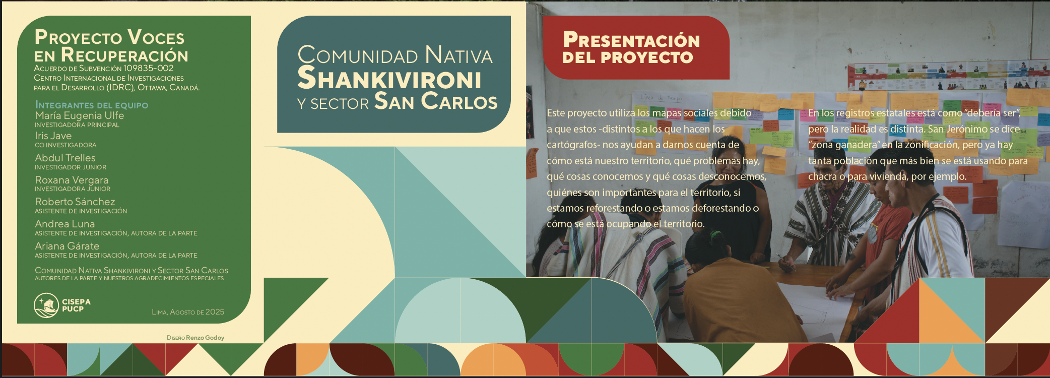 En el marco del mismo proyecto, desarrollamos un proceso de elaboración de cartografías comunitarias junto con las comunidades nativas de San Jerónimo y Shankivironi. Estas cartografías, trabajadas por los propios comuneros y comuneras, plasmaron su conocimiento sobre el territorio y fueron concebidas como herramientas para fortalecer la gestión y delimitación comunal. Los mapas producidos son tanto territoriales como sociales y culturales, pues integran elementos de la vida cotidiana, las memorias históricas y las relaciones que configuran el espacio comunitario. Las versiones finales fueron entregadas a ambas comunidades, con el propósito de que puedan apoyar sus proyectos locales relacionados con la defensa de su territorio.
