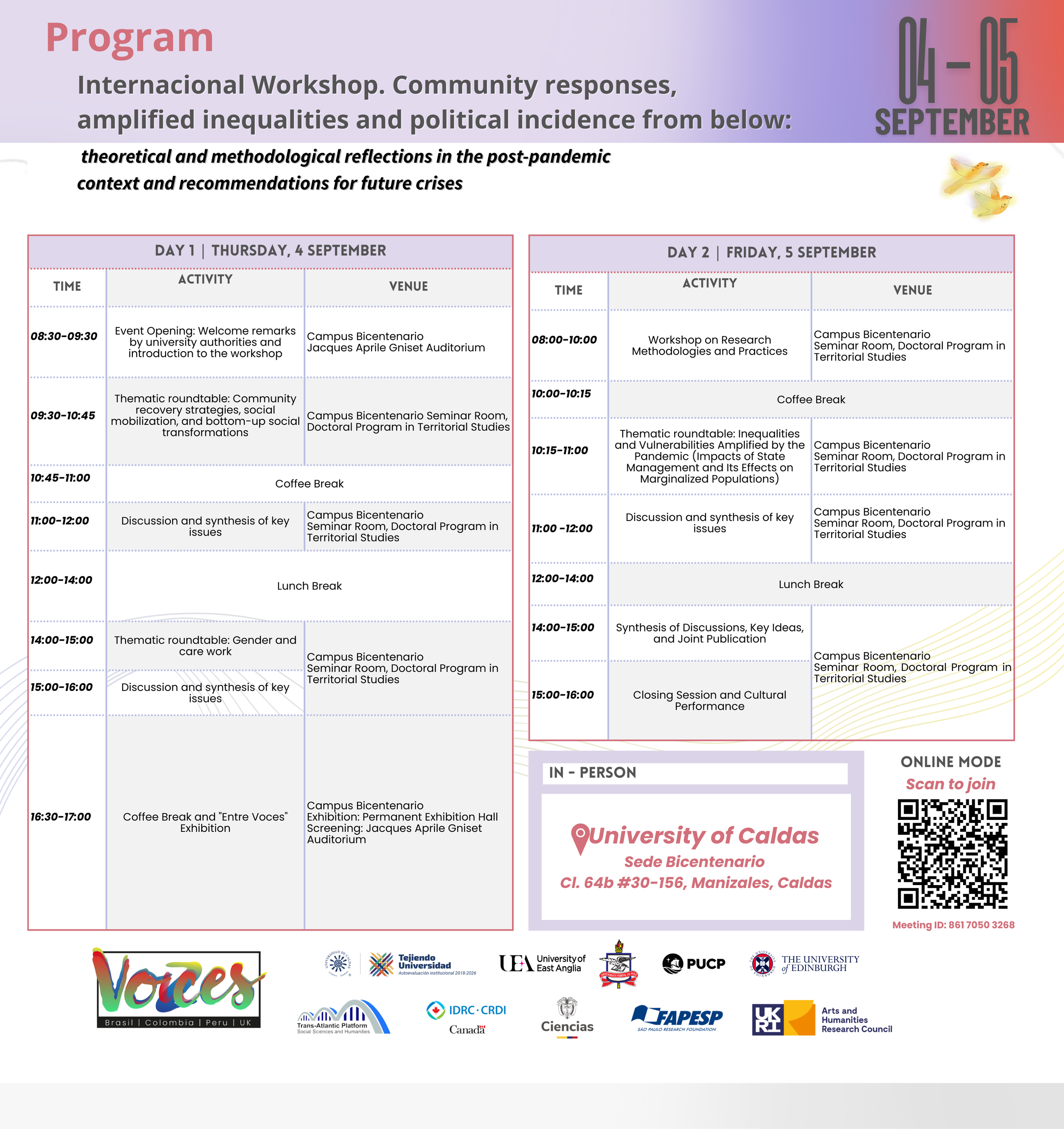Within the framework of the T-AP RRR call and the last virtual conference that brought together researchers from the funded projects, the Voices of Recovery team proposes a new space for dialogue through the international workshop "Community responses, amplified inequalities and political incidence from grassroots: theoretical and methodological reflections on the post-pandemic and recommendations for future crises". The workshop will take place in Manizales (Caldas, Colombia). However, if some participants cannot attend in person, the possibility of holding the event in an online format will be considered. In that case, certain sessions might be held via Zoom.